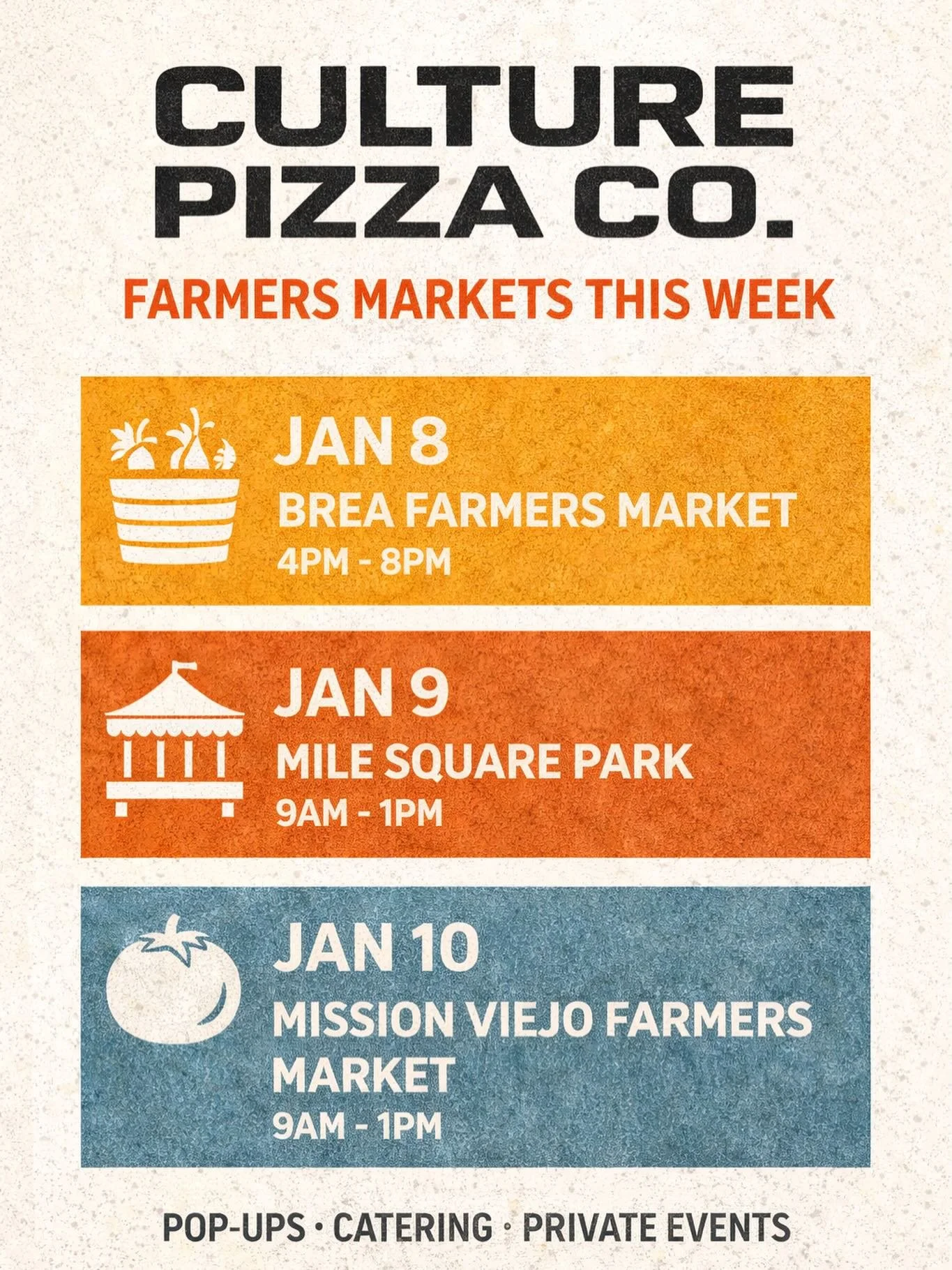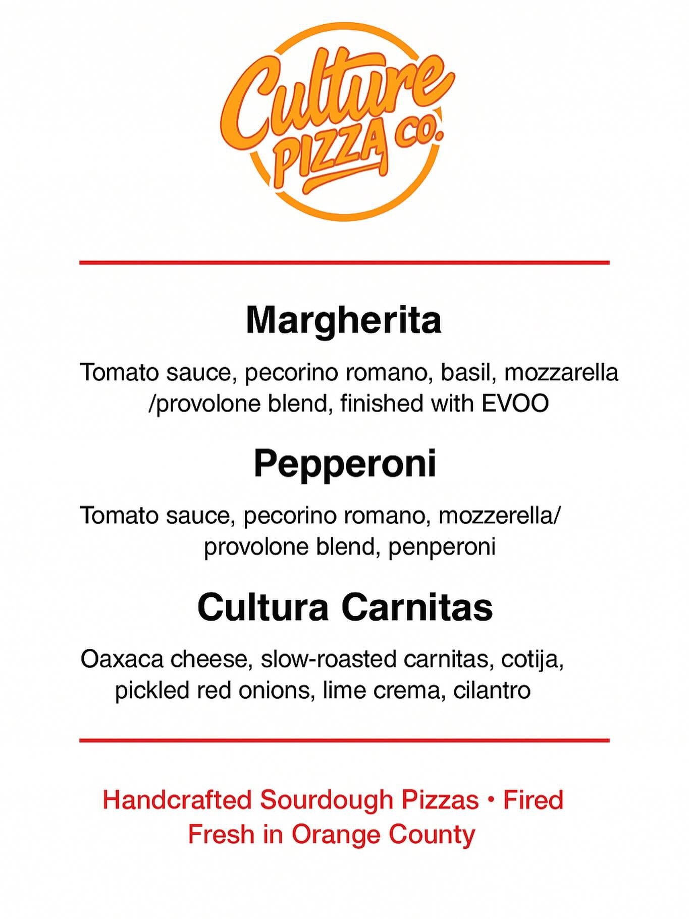 Culture Pizza Co is all about sourdough crust, epic toppings, and a strong sense of community. Born in Orange County, our artisan-fired pizzas are naturally leavened, handcrafted with care, and served hot at pop-ups across SoCal.